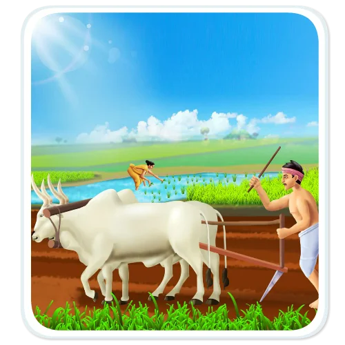 An illustration showing children riding a bullock cart through green Tamil fields, representing Playwithtamil’s cultural connection to Tamil heritage and learning.