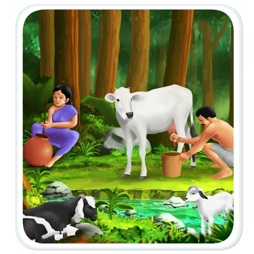 An illustration showing children riding a bullock cart through green Tamil fields, representing Playwithtamil’s cultural connection to Tamil heritage and learning.