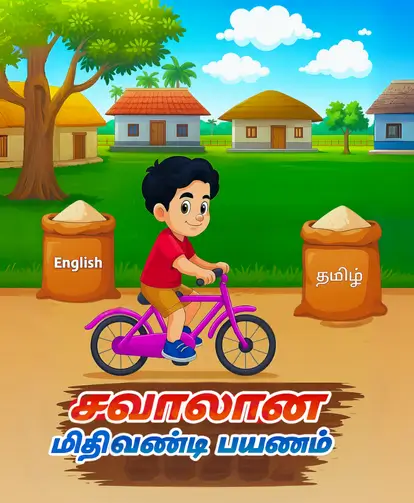 An illustration showing children riding a bullock cart through green Tamil fields, representing Playwithtamil’s cultural connection to Tamil heritage and learning.